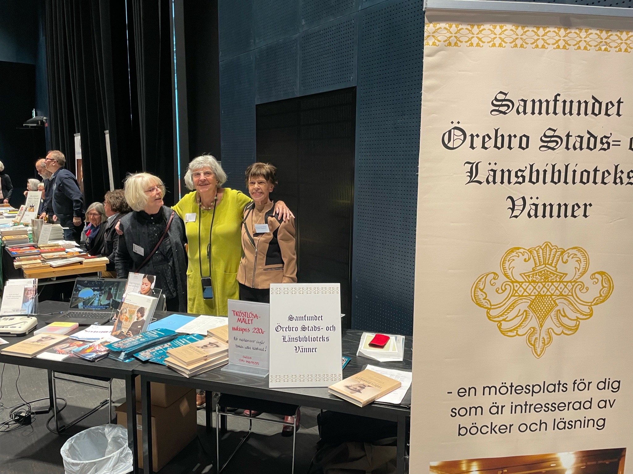 Tre damer vid bokvännernas bord som sålde slut på Jeremias: Gunilla Lindholm, Monica Wahlgren och Ella-Britt Lindeberg. Bilden från bokdagen 2021.